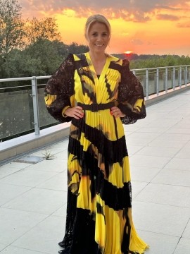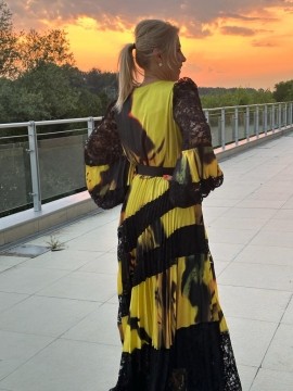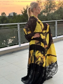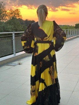 Rochie eleganta foarte pretioasa ,usoara ,ideala pentru evenimentele speciale din viata dumeavoastra .Rochia este taiata in talie prevazuta cu o curea decorativa , cambrata in partea de sus iar tip clos in partea inferioara .Manecile sunt bufante avand o lungime care poate fi reglata in functie de cerintele fiecareia !