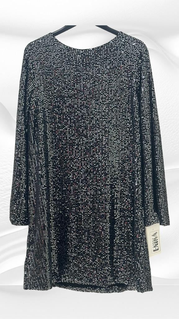 Rochia tunică cu paiete argintii are o croială modernă in A, mâneci clopot È™i o fundiță atrăgătoare în spate din material simplu negru . Cu o talie unică, potrivită pentru mărimile 34 până la 44, oferă confort datorită căptuÈ™elii delicate, fără a irita pielea. Este o alegere uÈ™oară È™i rafinată pentru evenimente speciale.